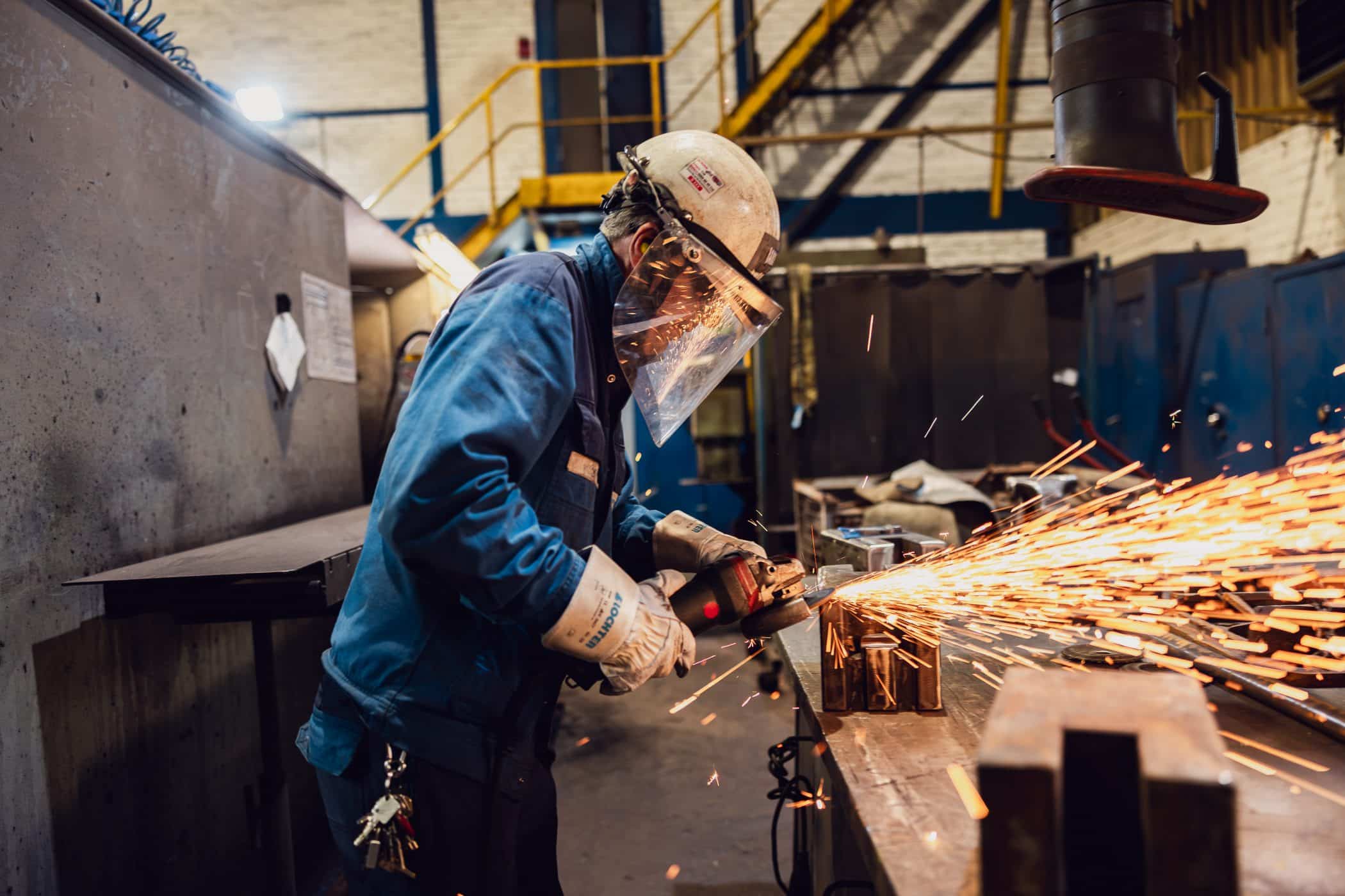 Junger Mitarbeiter in Arbeitskleidung haelt Schweisshelm in Werkhalle bei IVT in Oberhausen